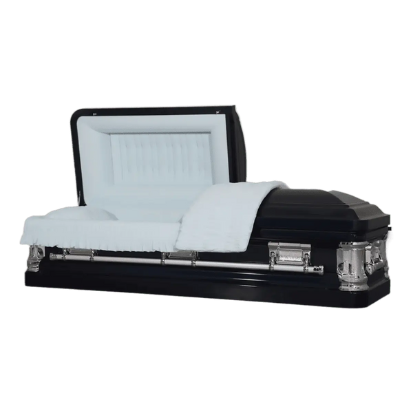 18 Gauge SealedBlue ExteriorWhite Velvet InteriorHalf CouchAdjustable BedRound Casket CornersFits In Standard Burial Vaults Casket Dimensions Exterior width of casket: 28″Exterior length of casket: 81″Exterior height of casket: 23 1/2″Interior...