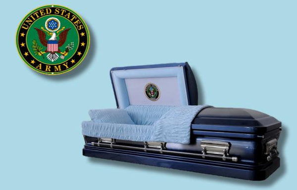 Casket Description The Hero UC Blue Army 18 Gauge Sealed Black exterior / Natural Brushed Blue Velvet Interior Half Couch Adjustable Bed Urn Casket Corners Fits In Standard Burial Vaults...