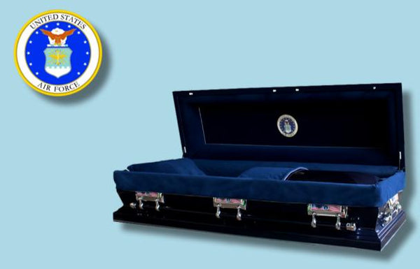 Casket Description The Hero Airforce Full Couch 18 Gauge Sealed Velvet Interior Half / Full Couch Adjustable Bed Square Urn Casket Corners Fits In Standard Burial Vaults Casket Dimensions Exterior...